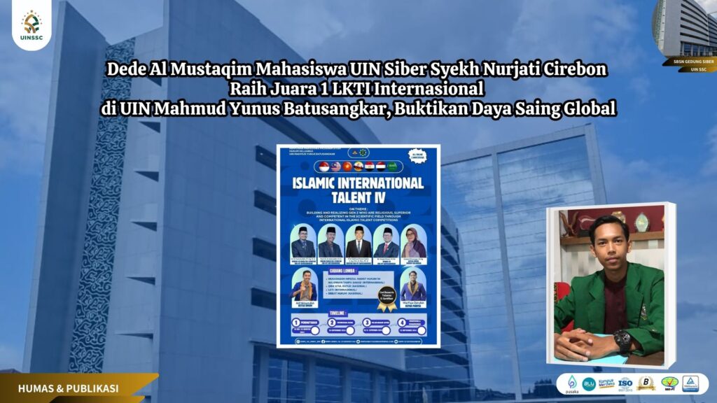 UIN Siber Cirebon – Dede Al Mustaqim, mahasiswa semester 7 Program Studi Hukum Ekonomi Syariah (HES) Fakultas Syariah UIN Siber Syekh Nurjati Cirebon atau yang dikenal dengan Cyber Islamic University (CIU), kembali mengukir prestasi gemilang di kancah internasional. Dede berhasil meraih Juara 1 dalam Lomba Karya Tulis Ilmiah (LKTI) Internasional Tahun 2024 yang diselenggarakan oleh Himpunan Mahasiswa Program Studi Hukum Keluarga (Ahwal Al Syakhshiyah) Fakultas Syariah UIN Mahmud Yunus Batusangkar.