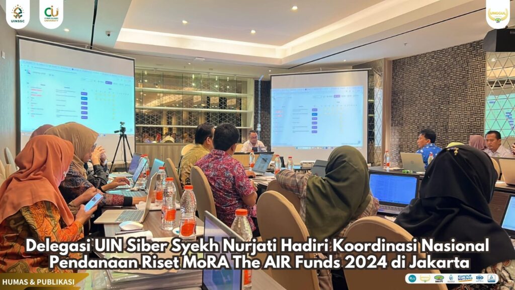 UIN Siber Cirebon (Jakarta) — Komitmen dalam mewujudkan tata kelola riset yang profesional, transparan, dan akuntabel kembali ditunjukkan oleh UIN Siber Syekh Nurjati Cirebon. Delegasi yang terdiri dari Ketua Lembaga Penelitian dan Pengabdian kepada Masyarakat (LPPM), yang diwakili oleh Kepala Pusat Penelitian Pengembangan Industri Mujib Ubaidillah, M.Pd., bersama dua anggota tim peneliti, Dr. Maulidya Ulfah, S.Pd.I., M.Pd.I. dan Nur Atikoh, M.Pd., hadir dalam undangan Koordinasi Nasional Pendanaan Riset MoRA The AIR Funds Program Tahun Anggaran 2024 yang diselenggarakan oleh Pusat Pembiayaan Pendidikan Agama dan Pendidikan Keagamaan (PUSPENMA), Sekretariat Jenderal Kementerian Agama RI.