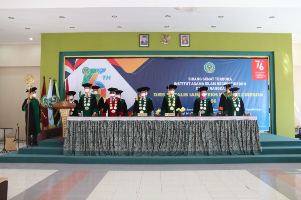 Senat Institut Agama Islam Negeri Syekh Nurjati Cirebon menggelar kegiatan Sidang Senat Terbuka dalam rangka kegiatan Diesnatalis IAIN SNJ Cirebon ke 56 bertempat di aula gedung pascasarjana dengan menerapkan prokes. Kegiatan tersebut diawali dengan prosesi yang melibatkan semua unsur pimpinan dengan pakaian khsusus dan dikawal pasukan Menwa memasuki ruang disnatalis. Kemudian acara dibuka langsung oleh Ketua Senat Institut, dan kemudian dilanjut mendengarkan pidato yang disampaikan langsung oleh Dr. H. Sumanta, M.Ag. (Rektor IAIN Syekh Nurjati Cirebon). Dalam kegiatan tersebut juga menampilkan penambilan musikal hadits yang merupakan juara II pada IPPBMM di Yogyakarta. Kamis (12/8/2021)