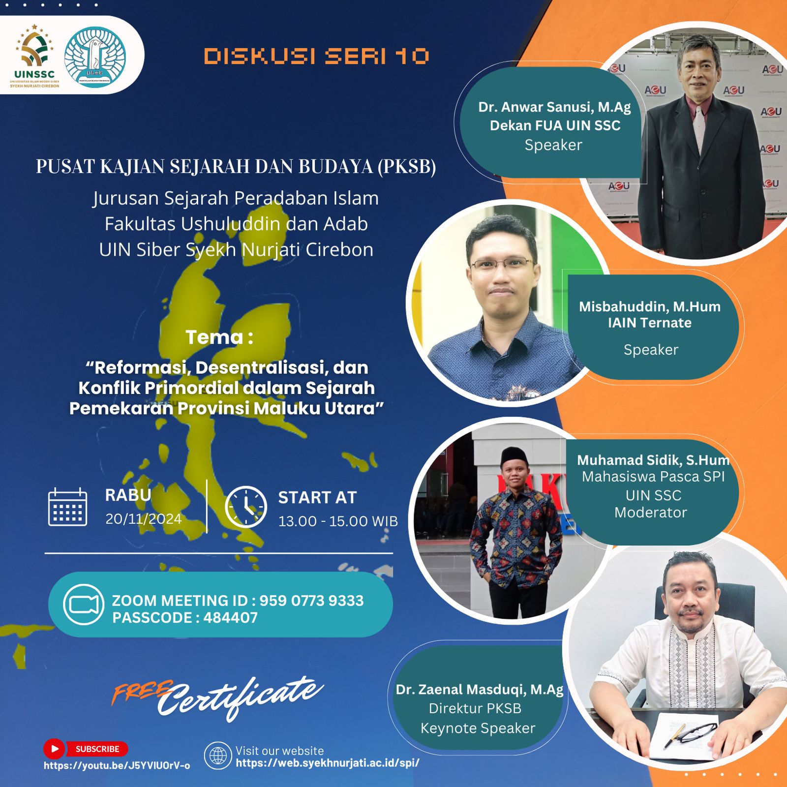 UIN Siber Cirebon – Pusat Kajian Sejarah dan Budaya (PKSB) Fakultas Ushuluddin dan Adab UIN Siber Syekh Nurjati Cirebon sukses menyelenggarakan diskusi seri ke-10 secara daring melalui Zoom. Dengan tema “Reformasi, Desentralisasi, dan Konflik Primordial dalam Sejarah Pemekaran Provinsi Maluku Utara,” diskusi ini berlangsung pada pukul 13.00–15.00 WIB dan menghadirkan dua narasumber: Misbahuddin, M.Hum., Koordinator Prodi Sejarah Peradaban Islam (SPI) IAIN Ternate, dan Dr. Anwar Sanusi, M.Ag., Dekan Fakultas Ushuluddin dan Adab UIN Siber Syekh Nurjati Cirebon. Diskusi dipandu oleh Muhamad Sidik, S.Hum., mahasiswa S2 Prodi SPI UIN Siber Syekh Nurjati Cirebon. Rabu, (20/11/2024).