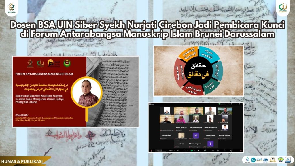 UIN Siber Cirebon – Prestasi membanggakan kembali ditorehkan oleh Universitas Islam Negeri Siber Syekh Nurjati Cirebon, yang juga dikenal dengan Cyber Islamic University (CIU). Dosen Jurusan Bahasa dan Sastra Arab (BSA) Fakultas Ushuluddin dan Adab (FUA) UIN Siber Syekh Nurjati Cirebon, H. Rijal Mahdi, Lc., M.A., tampil sebagai pembicara kunci dalam Forum Antarabangsa Manuskrip Islam yang diselenggarakan oleh Pusat Kajian Manuskrip Islam dan Melayu, Universiti Islam Sultan Sharif Ali (UNISSA), Brunei Darussalam, Sabtu (26/04/2025).