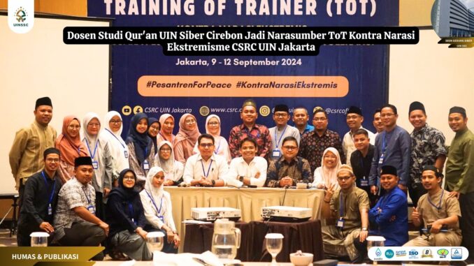 UIN Siber Cirebon (Bintaro, Tangerang Selatan) – Dalam upaya memperkuat narasi perdamaian dan melawan ekstremisme, Mohamad Yahya, Dosen Studi Qur’an Fakultas Ushuluddin dan Adab (FUA) UIN Siber Syekh Nurjati Cirebon, yang juga dikenal dengan Cyber Islamic University (CIU), menjadi narasumber dalam Training of Trainer (ToT) Kontra Narasi Ekstremisme yang diselenggarakan oleh Center for the Study of Religion and Culture (CSRC) UIN Syarif Hidayatullah Jakarta. Acara yang berlangsung pada 9-12 September 2024 di Santika Premiere Hotel, Bintaro, ini merupakan bagian dari program Pesantren for Peace (PfP) yang telah berjalan selama 9 tahun.