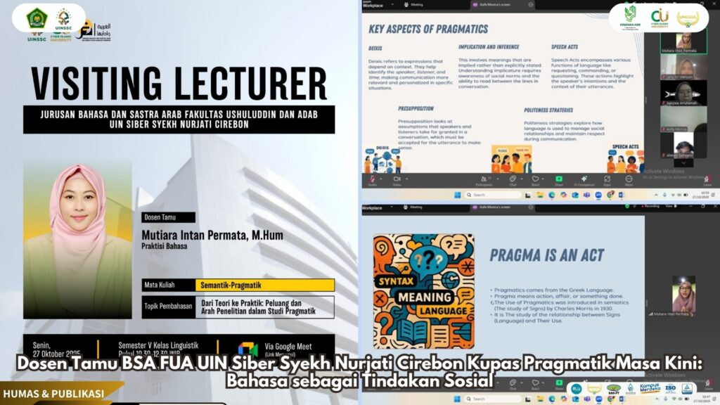 UIN Siber Cirebon — Jurusan Bahasa dan Sastra Arab (BSA) Fakultas Ushuluddin dan Adab (FUA) UIN Siber Syekh Nurjati Cirebon kembali menghadirkan kegiatan ilmiah inspiratif melalui Kuliah Dosen Tamu bertema “Understanding Pragmatics Today: The Study of Co(n)textual Meaning”, yang digelar secara daring pada Senin (27/10/).