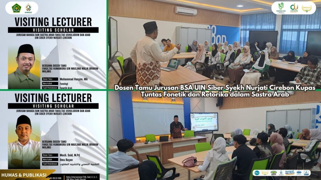 UIN Siber Cirebon – Jurusan Bahasa dan Sastra Arab (BSA), Fakultas Ushuluddin dan Adab (FUA), UIN Siber Syekh Nurjati Cirebon kembali menghadirkan atmosfer akademik yang dinamis melalui program Visiting Lecturer. Kegiatan ini mendatangkan dua dosen tamu dari Fakultas Humaniora UIN Maulana Malik Ibrahim Malang untuk memperdalam kajian fonetik Arab dan retorika sastra Arab.