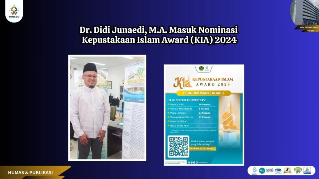 UIN Siber Cirebon – Dr. Didi Junaedi, M.A., dosen Jurusan Ilmu Al-Quran dan Tafsir (IAT) Fakultas Ushuluddin dan Adab (FUA) UIN Siber Syekh Nurjati Cirebon, masuk dalam nominasi ajang bergengsi Kepustakaan Islam Award (KIA) 2024. Pengumuman ini dirilis oleh Plt Direktur Urusan Agama Islam dan Pembinaan Syariah (Urais Binsyar), Ahmad Zayadi, pada Jumat, 11 Oktober 2024, melalui surat bernomor: B-2597/Dt. III.I/HM.02.2/10/2024.