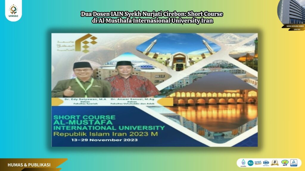 IAIN Cirebon (Iran) – Dr. Anwar Sanusi, M.Ag dan Dr. H. Edy Setyawan mengikuti kegiatan Short course yang diadakan dalam rentang 13 s.d. 29 November 2023 bertempat di Al Musthafa International University, Provinsi Qom, Iran. Kegiatan ini dilaksanakan sebagai wujud MoU antara kampus IAIN Syekh Nurjati Cirebon dengan Al Musthafa International University, Provinsi Qom, Iran. Kegiatan ini berdasarkan pada Surat Tugas Rektor Nomor: B-0947/In.08/R/Kp.01.1/11/2023 Tanggal 10 Nopember 2023.