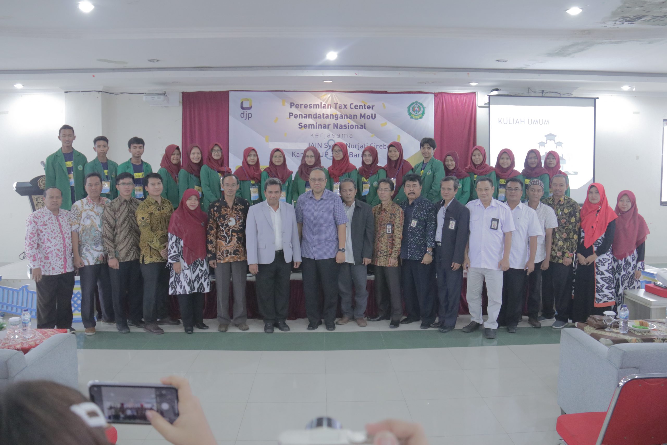 Fakultas Syariah Ekonomi Islam (FSEI) Institut Agama Islam Negeri (IAIN) Syekh Nurjati Cirebon bekerjasama dengan Kanwil DJP Jawa Barat II mengadakan penenandatanganan MoU dan peresmian Tax Center. Kegiatan penendatangannan MoU dan Peresmian Tax Center bertempat di aula gedung SBSN FSEI yang sekaligus melantik kepengurusn Tax Center IAIN Syekh Nurjati Cirebon. Penandatanganan MoU langsung oleh Drs. Yoyok Satiatomo, M.A (Ketua Kanwil DJP Jawa Barat II) dan Dr. H. Ilman Nafi’a, M.Ag (Warek III) didampingi oleh masing-masing pejabat terkait. Setelah itu diadakan pelantikan kepengurusn Tax Center IAIN Syekh Nurjati Cirebon oleh Warek III yang selanjutnya diteruskan dengan peresmian Tax Center IAIN Syekh Nurjati Cirebon dan disaksikan anggota pengurur Tax Center IAIN Syekh Nurjati Cirebon yang baru dilantik. Kamis (27/02)