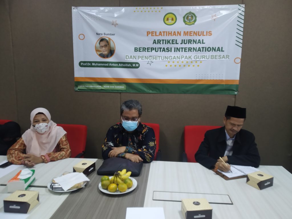 Pelatihan Menulis Artikel Jurnal Bereputasi Internasional dan Penghitungan PAK Guru Besar oleh Prof. Dr. Mohammad Anton Atholillah, MM di Lingkungan FUAD IAIN Syekh Nurjati Cirebon.