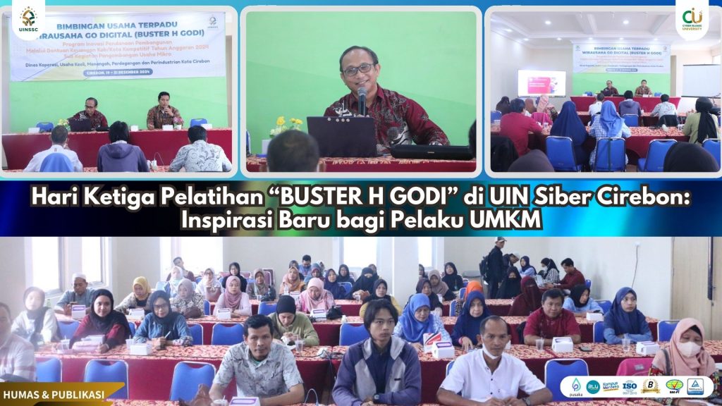 UIN Siber Cirebon – Hari ketiga pelatihan “BUSTER H GODI” yang berlangsung di Universitas Islam Negeri (UIN) Siber Syekh Nurjati Cirebon, atau yang lebih dikenal sebagai Cyber Islamic University (CIU), menghadirkan sesi yang penuh inspirasi dan wawasan baru bagi para pelaku UMKM. Sabtu, (21/12/2024).
