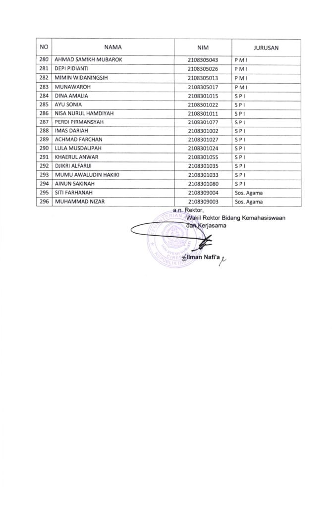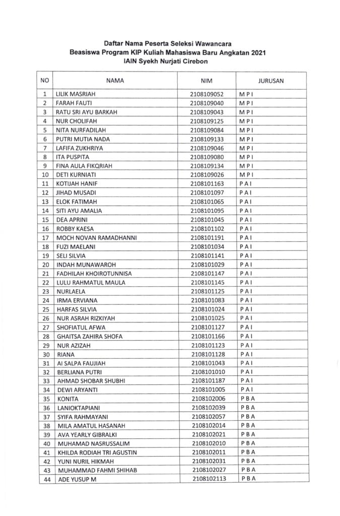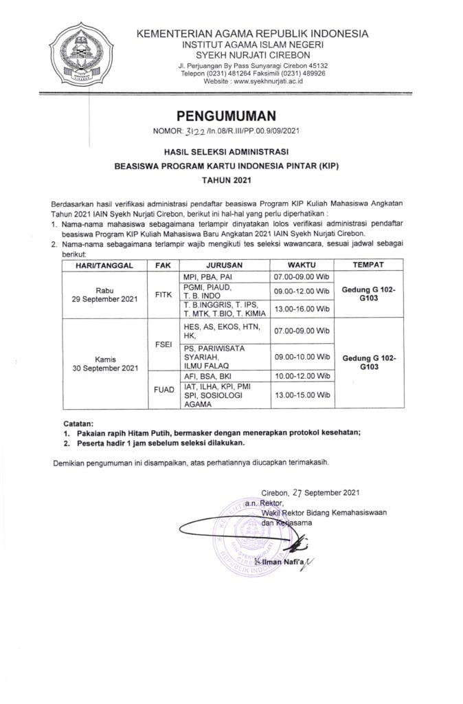 - Nama-nama mahasiswa sebagaimana terlampir dinyatakan lolos verifikasi administrasi pendaftar beasiswa Program KIP Kuliah Mahasiswa Baru Angkatan 2021 lAlN Syekh Nurjati Cirebon.