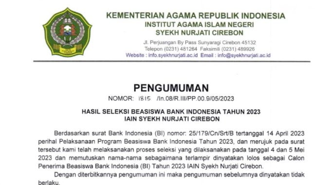 HASIL SELEKSI BEASISWA BANK INDONESIA TAHUN 2023 IAIN SYEKH NURJATI CIREBON 19 Mei 2023 arifin Pengumuman 0 Unduh Pengumuman PENGUMUMAN HASIL SELEKSI CALON PENERIMA BEASISWA BI 2023 IAIN05172023084601