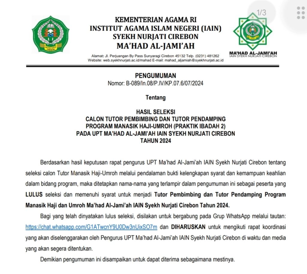 HASIL SELEKSI CALON TUTOR PEMBIMBING DAN TUTOR PENDAMPING PROGRAM MANASIK HAJI-UMROH (PRAKTIK IBADAH 2) PADA UPT MA’HAD AL-JAMI’AH IAIN SYEKH NURJATI CIREBON TAHUN 2024
