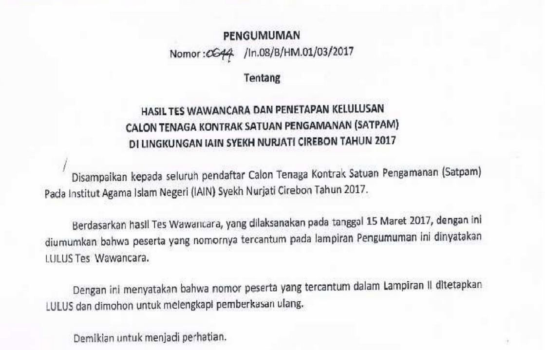 Hasil tes wawancara dan penetapan kelulusan tenaga kontrak SATPAM 20 Maret 2017 arifin Informasi, Kegiatan 0 Humas dan Publikasi
