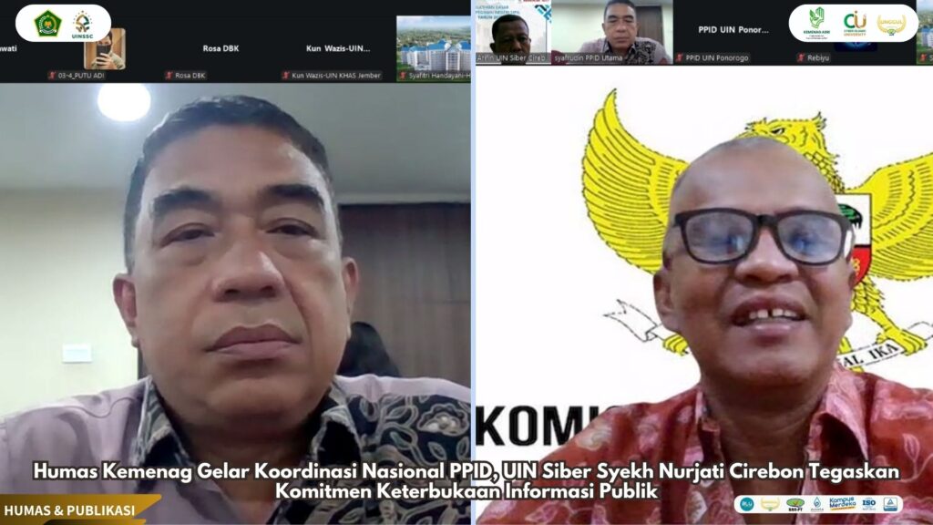 UIN Siber Cirebon (Jakarta, Kemenag) – Humas Kementerian Agama Republik Indonesia menggelar Rapat Koordinasi Pejabat Pengelola Informasi dan Dokumentasi (PPID) secara daring pada Jumat (24/10/2025). Kegiatan ini diikuti oleh seluruh tim PPID di lingkungan Perguruan Tinggi Keagamaan Negeri (PTKN) se-Indonesia, termasuk UIN Siber Syekh Nurjati Cirebon, yang diwakili oleh Kepala UPT Pustikom, Riyanto, S.T., M.Kom., dan Pranata Humas Ahli Muda, Mohamad Arifin, M.Pd.I. (24/10).