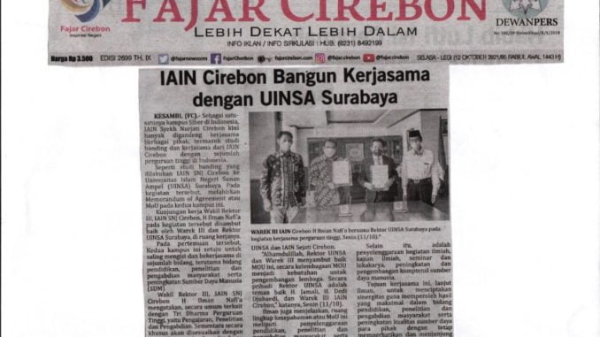 IAIN Cirebon Bangun Kerjasama dengan UINSA Surabaya (Fajar Cirebon/12 Oktober 2021) 15 Oktober 2021 arifin Kliping Digital 0 IAIN Cirebon Bangun Kerjasama dengan UINSA Surabaya