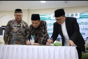 IAIN Cirebon (Indramayu) – Rektor IAIN Syekh Nurjati Cirebon, Prof Dr H Aan Jaelani, M.Ag., turut serta dalam acara penandatanganan kerjasama dan kemitraan dengan Lembaga Dakwah NU (LDNU) PBNU dan Kanwil Kemenag Propinsi Jawa Barat. Acara ini dilaksanakan di Asrama Haji Indramayu dan bertujuan untuk mendukung pelaksanaan Tridharma Perguruan Tinggi, khususnya dalam penyiapan Sumber Daya Manusia (SDM) untuk Sertifikasi Calon Pembimbing Manasik Haji. Sabtu, (17/02/2024).