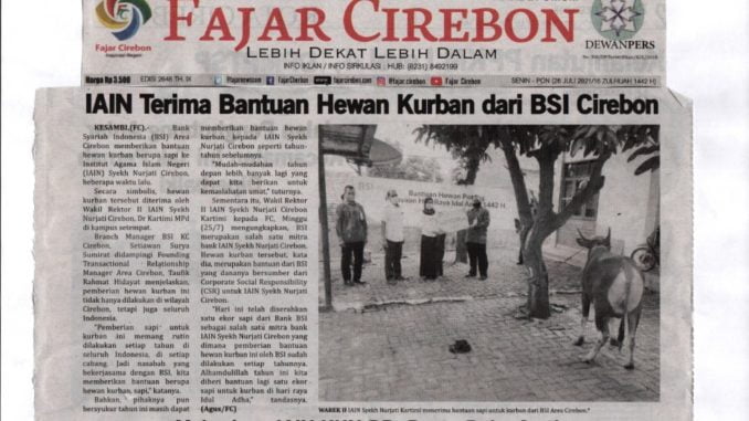 IAIN Terima Bantuan Hewan Kurban dari BSI Cirebon (Fajar Cirebon/26 Juli 2021) 13 Oktober 2021 arifin Kliping Digital 0 IAIN Terima Bantuan Hewan Kurban dari BSI Cirebon
