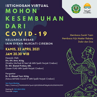Institut Agama Islam Negeri (IAIN) Syekh Nurjati Cirebon dalam Upaya pencegahan sekaligus dijauhkan dari virus Covid 19, IAIN Syekh Nurjati Cirebon menggelar kegiatan istighosah secara virtual. Istighosah ini digelar sebagai bentuk permohonan kepada Allah SWT yang dilakukan melalui doa dan zikir, dengan tujuan agar seluruh pimpinan, dosen dan karyawan mendapat perlindungan sekaligus dijauhkan dari bahaya pandemi virus corona. Kamis (22/4/2021)