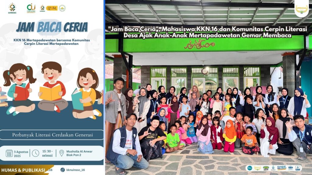 UIN Siber Cirebon (Mertapadawetan) – Semangat menumbuhkan minat baca sejak dini terus digaungkan oleh Kelompok KKN 16 UIN Siber Syekh Nurjati Cirebon. Pada Minggu, 3 Agustus 2025, mereka menggelar kegiatan bertajuk “Jam Baca Ceria” yang diselenggarakan di halaman Musholla Al Anwar, Blok PON 2, Desa Mertapadawetan, Kecamatan Astanajapura, Kabupaten Cirebon.