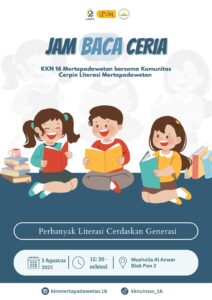 Acara ini berlangsung dari pukul 15.30 hingga 17.30 WIB dan dihadiri puluhan anak-anak setempat yang tampak antusias mengikuti rangkaian kegiatan membaca bersama. Kegiatan ini merupakan hasil kolaborasi antara Kelompok KKN 16 Desa Mertapadawetan dan Komunitas Cerpin Literasi Desa, serta mendapat dukungan dari aparatur desa, termasuk Kepala Dusun setempat.