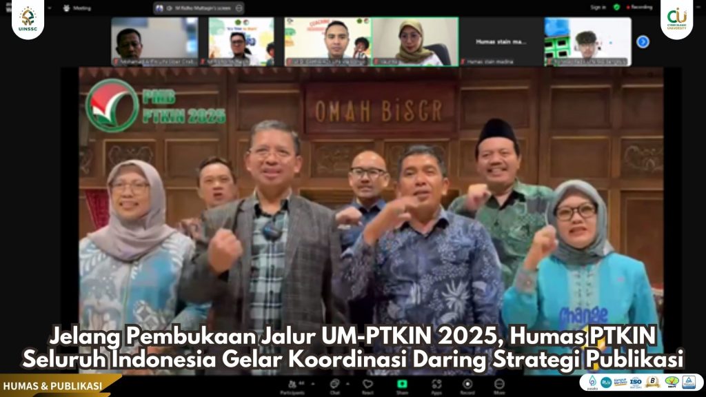 UIN Siber Cirebon — Menjelang dibukanya pendaftaran Ujian Masuk Perguruan Tinggi Keagamaan Islam Negeri (UM-PTKIN) tahun 2025 pada 22 April 2025, Panitia Nasional PMB PTKIN melalui Pokja Humas menggelar Koordinasi Daring Strategi Publikasi secara virtual pada Senin (21/4/2025), pukul 10.00 – 12.00 WIB.