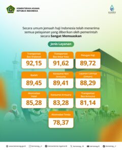 “Meski demikian, hasil survei BPS menunjukkan indeks layanan akomodasi hotel tetap berada pada kategori Sangat Memuaskan. Sementara itu, layanan konsumsi dan transportasi di Armuzna tercatat dalam kategori Memuaskan,” kata Menag.