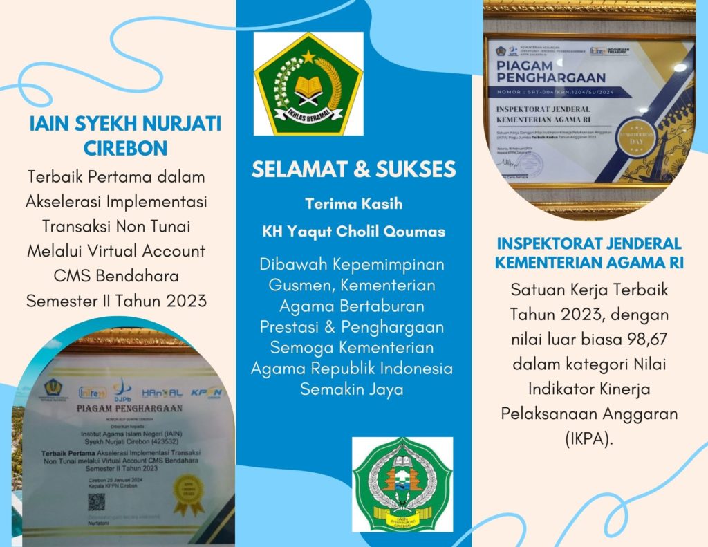 IAIN Cirebon – Kementerian Agama Republik Indonesia sekali lagi menorehkan prestasi gemilang di bawah kepemimpinan Menteri Agama Yaqut Cholil Qoumas. Surat Keputusan Kementerian Keuangan Republik Indonesia, melalui Keputusan Kepala Kantor Pelayanan Perbendaharaan Negara Tipe A1 Jakarta IV Nomor Kep-17/KPN.1204/2024 tentang Penetapan Peringkat Satuan Kerja Terbaik Tahun 2023. Inspektorat Jenderal Kementerian Agama RI dinobatkan sebagai Satuan Kerja Terbaik Tahun 2023, dengan nilai luar biasa 98,67 dalam kategori Nilai Indikator Kinerja Pelaksanaan Anggaran (IKPA). Jumat, (16/02/2024).