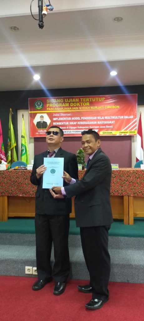 MATA Carlan tak bisa melihat sejak lahir. Namun semangatnya mampu menghantarkannya jadi ASN terbaik se Jawa Barat pada 2019. Kini, selangkah lagi dia bakal menjadi doktor pertama Pascasarjana IAIN Syekh Nurjati Cirebon.