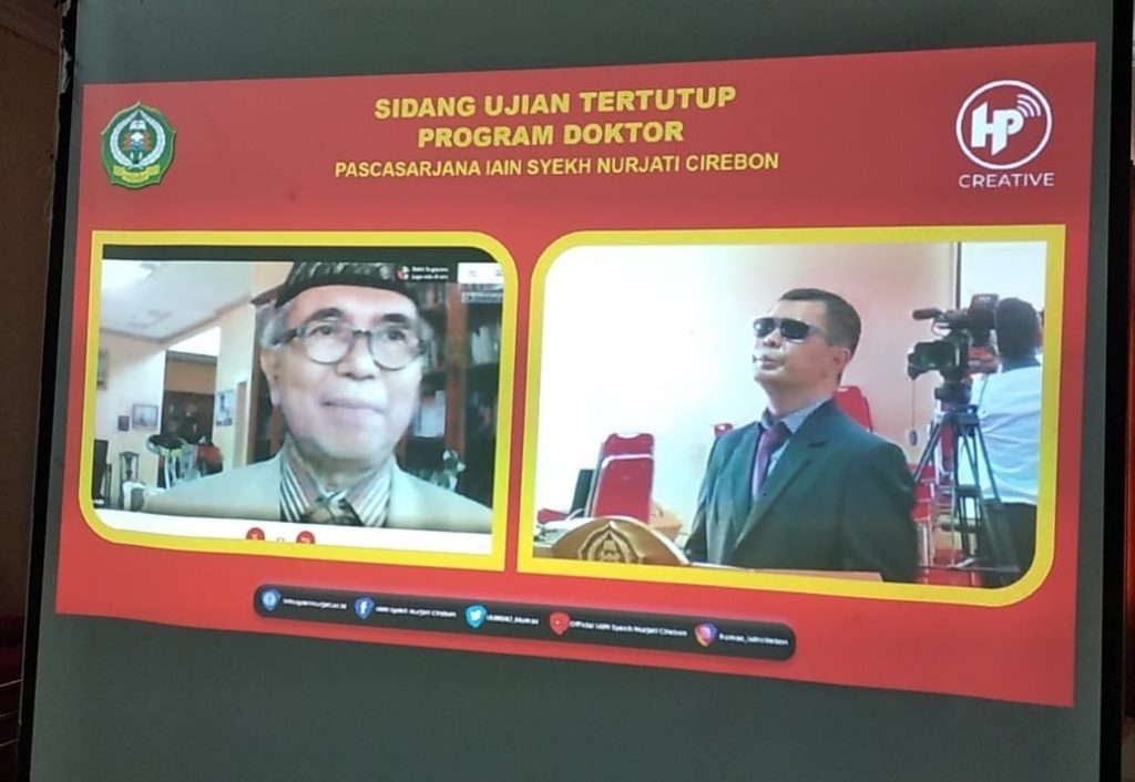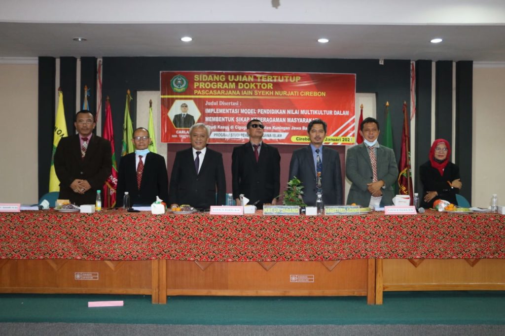 Carlan mempresentasikan disertasinya di hadapan Prof Dr H Abdurrahman Mas’ud MA selaku Penguji Eksternal melalui zoom serta Prof Dr H Adang Djumhur MAg dan Prof Dr H Jamali selaku Penguji Internal langsung di ruang sidang. Disaksikan Ketua Sidang, Prof Dr H Dedi Djubaedi MAg dan Sekretaris Sidang, H Didin Nurul Rosidin MA PhD.