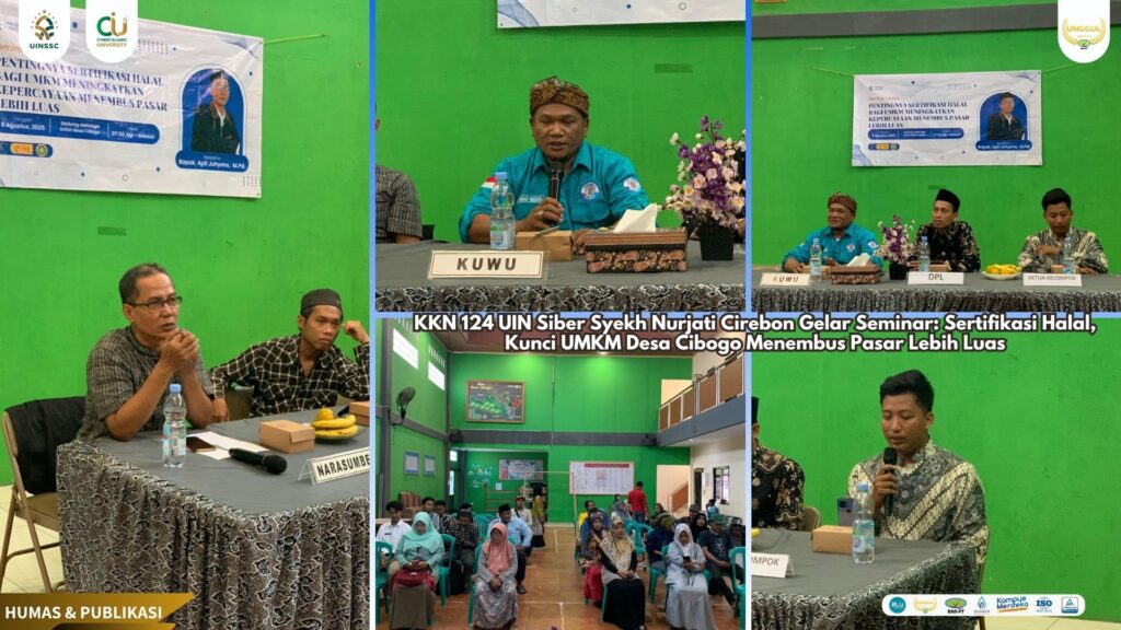 UIN Siber Cirebon (Cibogo) – Dalam upaya meningkatkan daya saing pelaku usaha mikro, kecil, dan menengah (UMKM) di tingkat lokal, Kelompok KKN 124 UIN Siber Syekh Nurjati Cirebon menggelar seminar bertajuk “Pentingnya Sertifikasi Halal Bagi UMKM: Meningkatkan Kepercayaan, Menembus Pasar Lebih Luas” di Gedung Olahraga Balai Desa Cibogo. Kegiatan yang berlangsung sejak pukul 07.30 hingga 10.00 WIB ini menghadirkan pelaku UMKM, aparat desa, mahasiswa, serta masyarakat umum yang tertarik dalam dunia usaha.(08/08).