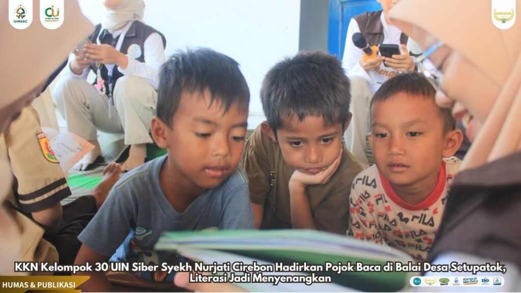 UIN Siber Cirebon (Setupatok) — Suasana Balai Desa Setupatok sore itu berbeda dari biasanya. Tawa riang anak-anak memenuhi ruangan, sementara buku-buku warna-warni tersusun rapi di sudut ruangan. Inilah Pojok Baca Vol. 1, program literasi perdana yang digagas oleh KKN Kelompok 30 UIN Siber Syekh Nurjati Cirebon, yang berlangsung pada Kamis (7/8/2025) pukul 15.00–17.00 WIB.