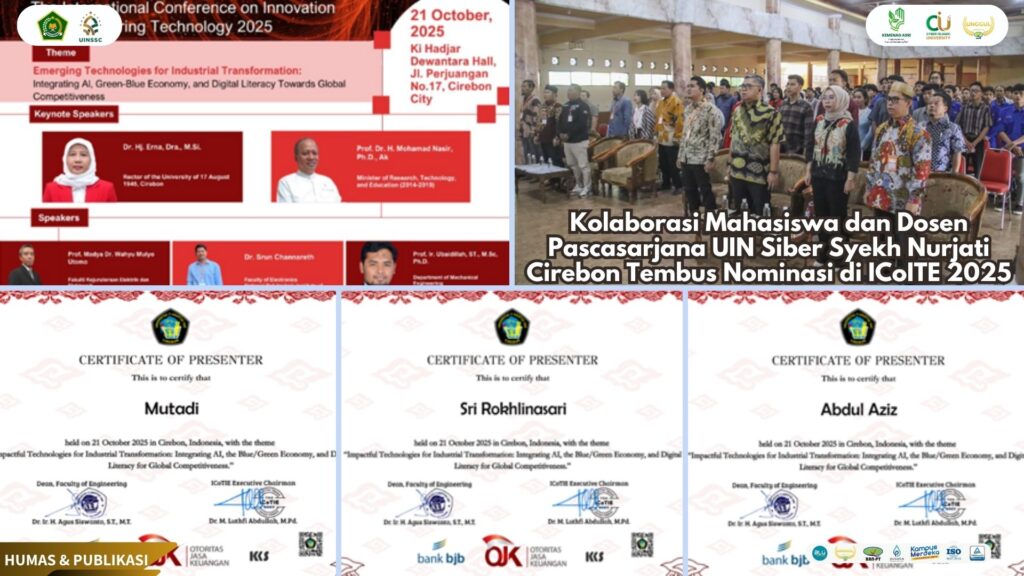 UIN Siber Cirebon — Kiprah akademik UIN Siber Syekh Nurjati Cirebon kembali mencuri perhatian di forum ilmiah internasional. Salah satu mahasiswa Program Doktor Ekonomi Syariah, Mutadi, berkolaborasi dengan dua dosen Pascasarjana UIN Siber Syekh Nurjati Cirebon, Prof. Dr. Abdul Aziz, M.Ag., dan Dr. Hj. Sri Rokhlinasari, M.Si., sukses mempresentasikan makalah berjudul “Research Instrument” dalam International Conference on Innovative Technology & Engineering (ICoITE) 2025, yang digelar di Fakultas Teknik Universitas 17 Agustus 1945 (UNTAG) Cirebon.