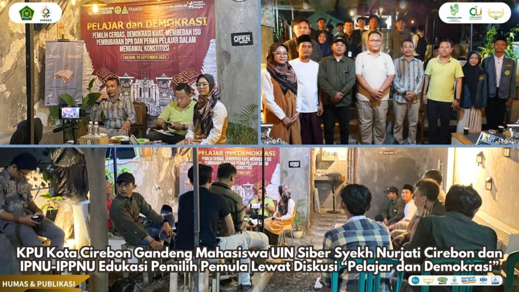 UIN Siber Cirebon – Komisi Pemilihan Umum (KPU) Kota Cirebon bersama mahasiswa Praktik Pengalaman Lapangan (PPL) UIN Siber Syekh Nurjati Cirebon menggelar diskusi bertajuk “Pelajar dan Demokrasi: Pemilih Cerdas, Demokrasi Kuat” di Nawa Coffee, Cirebon. Kegiatan ini menghadirkan pelajar yang tergabung dalam Ikatan Pelajar Nahdlatul Ulama (IPNU) dan Ikatan Pelajar Putri Nahdlatul Ulama (IPPNU) sebagai peserta aktif.(19/09).
