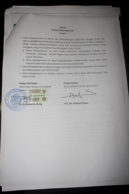 Senin, 25 April 2016 IAIN Syekh Nurjati Cirebon menerima kunjungan H.E. Mr. Bahaa El Deen Dessouki Duta Mesir untuk Indonesia, kunjungan Duta Mesir untuk Indonesia dan rombong memiliki beberapa agenda diantaranya adalah melakukan Penandatangan Nota Kesepahaman (MoU), maksud, tujuan dan asas dari Nota Kesepahaman ini adalah untuk meningkatkan kerjasama dan kemitraan antara IAIN Syekh Nurjati Cirebon dengan Duta Mesir untuk Indonesia dalam hal kesamaan visi dan misi, guna meningkatkan, mengembangkan, memberdayakan potensi, kebersamaan, kesetaraan serta saling memberi manfaatdalam halPendidikan, Penelitian, dan Pengabdian Kepada Masyarakat. Nota Kesepahaman ini belaku selama 5 (lima) Tahun semenjak Tanggal ditandatangani oleh kedua belah pihak.