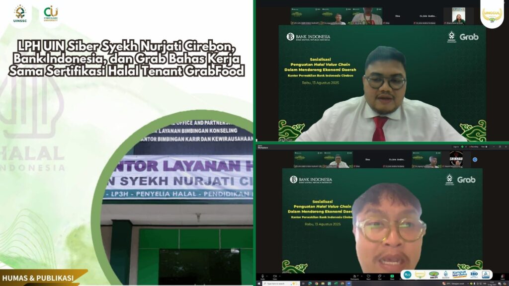 UIN Siber Cirebon — Lembaga Penjamin Halal (LPH) UIN Siber Syekh Nurjati Cirebon bersama Kantor Perwakilan Bank Indonesia (KPwBI) Cirebon dan Grab Indonesia menggelar pertemuan daring melalui Zoom Meeting dalam rangka membahas rencana kerja sama sertifikasi halal bagi tenant-tenant GrabFood di wilayah Ciayumajakuning. Inisiatif ini menjadi langkah strategis dalam mendorong percepatan sertifikasi halal di sektor ekonomi digital, khususnya layanan pesan-antar makanan berbasis aplikasi. (12/08).