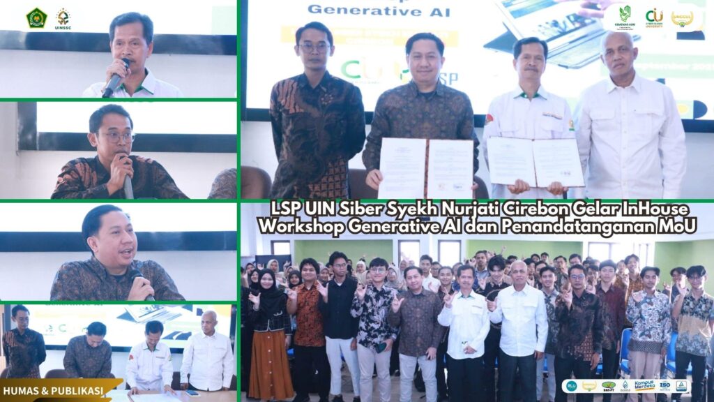 UIN Siber Cirebon – Lembaga Sertifikasi Profesi (LSP) Universitas Islam Negeri (UIN) Siber Syekh Nurjati Cirebon menggelar InHouse Workshop Generative AI sekaligus melaksanakan penandatanganan Nota Kesepahaman (MoU) dengan mitra strategis, bertempat di Auditorium Rektorat lantai 3. Kegiatan ini dihadiri jajaran pimpinan UIN Siber Syekh Nurjati Cirebon termasuk Kepala Biro AKU Dr. H. Susari, MA., mitra industri, serta mahasiswa yang menjadi peserta workshop. (29/09).
