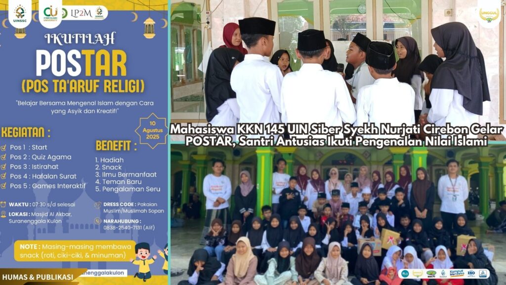 UIN Siber Cirebon (Suranenggala Kulon) – Mahasiswa Kuliah Kerja Nyata (KKN) 145 UIN Siber Syekh Nurjati Cirebon sukses melaksanakan kegiatan Pos Ta’aruf Religi (POSTAR) di Desa Suranenggala Kulon, Kecamatan Suranenggala, Kabupaten Cirebon. Kegiatan ini bertujuan memperkuat pemahaman keagamaan sekaligus menumbuhkan semangat kebersamaan santri dan masyarakat desa.(10/08).