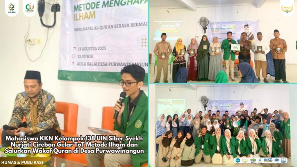 UIN Siber Cirebon (Purwawinangun) — Mahasiswa Kuliah Kerja Nyata (KKN) Kelompok 138 UIN Siber Syekh Nurjati Cirebon sukses menggelar Training of Trainer (ToT) Metode Ilham serta menyalurkan wakaf Quran kepada sejumlah lembaga pendidikan Al-Quran di Desa Purwawinangun. Kegiatan ini berlangsung di Aula Kantor Kuwu Desa Purwawinangun, Rabu (13/8), dan mengangkat tema unik dan menarik: “Menghafal Al-Qur’an Serasa Bermain Game.”