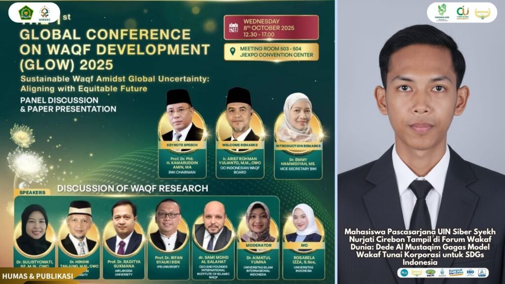 UIN Siber Cirebon — Nama Dede Al Mustaqim, S.H., mahasiswa Magister Hukum Keluarga Islam UIN Siber Syekh Nurjati Cirebon, kembali mengharumkan dunia akademik Indonesia di kancah internasional. Dalam ajang The 1st Global Conference on Waqf Development (GLOW) 2025, ia tampil sebagai presenter terpilih dan memaparkan gagasan inovatif tentang model wakaf tunai korporasi (corporate cash waqf) untuk mendukung Sustainable Development Goals (SDGs) di Indonesia.
