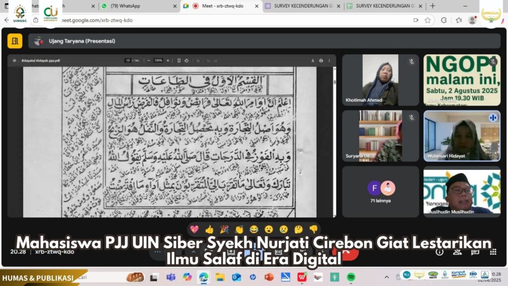 UIN Siber Cirebon – Himpunan Mahasiswa Jurusan (HMJ) Pendidikan Jarak Jauh (PJJ) Universitas Islam Negeri (UIN) Siber Syekh Nurjati Cirebon kembali melanjutkan program unggulannya: Kajian Rutin Khasanah Kitab Klasik yang telah memasuki tahun kedua pelaksanaannya. Kegiatan ini resmi dibuka pada Ahad, 2 Agustus 2025, menandai dimulainya semester ganjil tahun akademik 2025–2026.