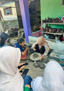 Selama kegiatan, mahasiswa dibekali pengetahuan mengenai proses pembuatan gerabah mulai dari pemilihan tanah liat, teknik pembentukan dengan alat tradisional, pengeringan alami, hingga pembakaran di tungku terbuka. Tidak hanya itu, mahasiswa juga diajak berinteraksi langsung dengan pengrajin lokal dan mencoba sendiri membentuk gerabah sederhana, sebuah pengalaman yang membuka wawasan baru tentang proses kreatif seni tradisional.