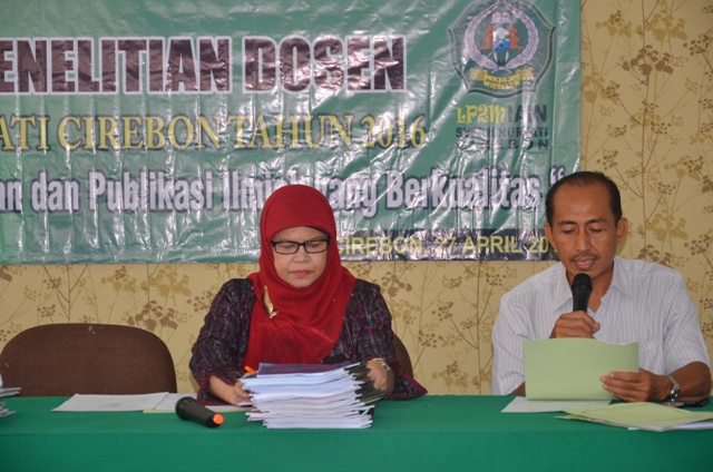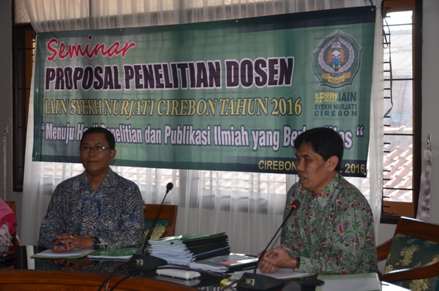 Rabu, 27 April 2016 Lembaga Penelitian dan Pengabdian Masyarakat (LPPM) melalui Pusat Penelitian dan Penerbitan IAIN Syekh Nurjati Cirebon telah melaksanakan kegiatan Seminar Proposal Penelitian Bagi Dosen di Lingkungan IAIN Syekh Nurjati Cirebon dengan tema ” Menuju hasil Penelitian dan Publikasi Ilmiah yang Berkualitas”. Kegiatan ini bertempat di 2 (dua) tempat yang berbeda yakni di Ruang Rapat Senat dan Rektorat lt.3 kegiatan ini dilaksanakan mulai pukul 08.00 s.d 17.00, menurut Penanggungjawab/ Ketua kegiatan seminar kali ini adalah Warek I Dr. Saefuddin Zuhri, M. Ag melalui Ketua Pusat LPPM Dr. H. Bambang Yuniarto, M. Si mengatakan tujuan seminar ini adalah untuk Presentasi Proposal Penelitian baik secara Personal maupun kelompok, Mereview Proposal Penelitian dan Seleksi Proposal Penelitian. Narasumber kegiatan seminar kali ini adalah 1. Prof. Dr. Enok Maryani, M. Pd ( UPI Bandung) 2. Prof. Dr. Sarwiji Suwandi, M. Pd (UNS) 3. Prof. Dr. Ahmad Rofiq, MA (UIN Walisongo Semarang) 4. Dr. Paidi, M.Si (UNY).