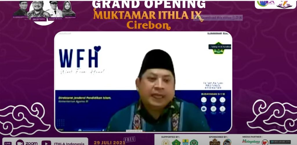 Prof. Dr. H. M. Ali Ramdhani (Dirjen Kemenag RI) dalam sambutannya beliau juga menyampaikan terima kasih kepada Dr. H. Sumanta, M.Ag (Rektor IAIN Syekh Nurjati Cirebon) dimana IAIN Syekh Nurjati Cirebon bersedia menjadi tuan rumah Muktamar ITHLA ke IX yang dilaksanakan secara onliene tahun ini.