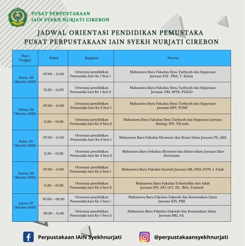 Perpustakaan Pusat Institut Agama Islam Negeri (IAIN) Syekh Nurjati Cirebon menggelar kegiatan Orientasi Pendidikan Pemustaka Mahasiswa Baru Program S1 Tahun 2022 dengan tema “Melalui Library User Education Kita Wujudkan Syekh Nurjati Muda/SENADA “. Hari pertama kegiatan tersebut dibuka langsung oleh Dr. H. Saefudin Zuhri, M.Ag (Warek I) didampingi oleh Dr. H. Yayat Suyana, M.Ag (Ketua Perpustakaan Pusat), Tohirin, S.Ag, S.I.P.I (Ketua Pelaksana) dan staff Perpustakaan Pusat. Senin, 03/10/22)
