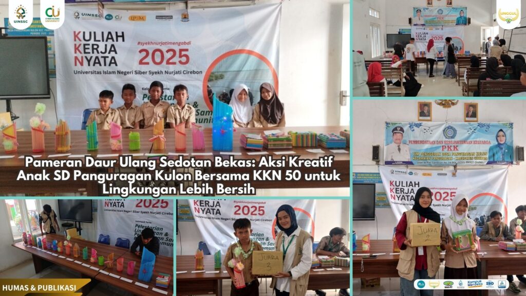 UIN Siber Cirebon (Panguragan Kulon) — Ruang Serba Guna Balai Desa Panguragan Kulon hari ini tampak semarak dan penuh warna. Puluhan hasil karya unik terpajang rapi, mulai dari kotak tisu, tempat pensil, hingga miniatur dekoratif, semua terbuat dari bahan yang tak disangka-sangka: sedotan bekas.(14/08).