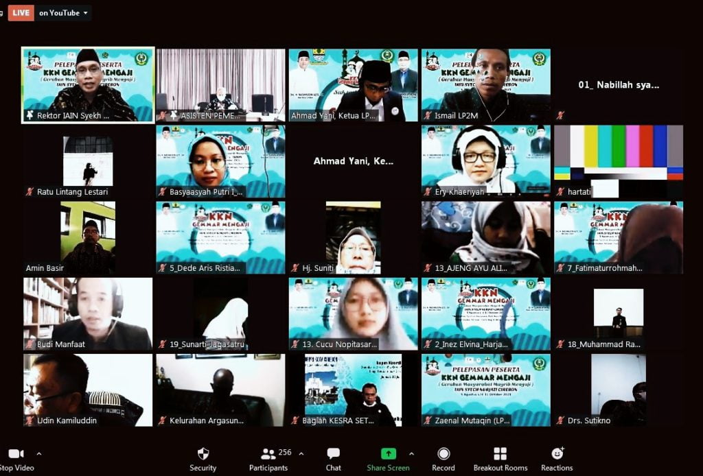 Lembaga Penelitian dan Pengabdian kepada Masyarakat (LPPM) Institut Agama Islam Negeri (IAIN) Syekh Nurjati Cirebon mengadakan acara pelepasan peserta kegiatan Kuliah Kerja Nyata (KKN), Gerakan Masyarakat Maghrib (Gemmar) Mengaji, kegiatan ini dilaksanakan secara virtual zoom meeting dan via youtube channel LP2M menara Perti. Hadir dalam acara pelepasan ini Rektor IAIN beserta jajaran Pimpinan IAIN Syekh Nurjati Cirebon, Wali Kota Cirebon yang diwakili oleh Asisten Pemerintahan dan Kesra Kota Cirebon, Camat dan Lurah se-Kota Cirebon, Dosen Pembimbing Lapangan, dan 364 Peserta KKN. Rektor IAIN SNJ Cirebon, Dr. H. Sumanta, M.Ag secara resmi melepas 364 mahasiswa peserta KKN Gemmar Mengaji untuk selanjutnya melaksanakan kegiatan sesuai dengan pedoman dan Juknis yang sudah mereka dapatkan dalam pembekalan. (5/8/2021).
