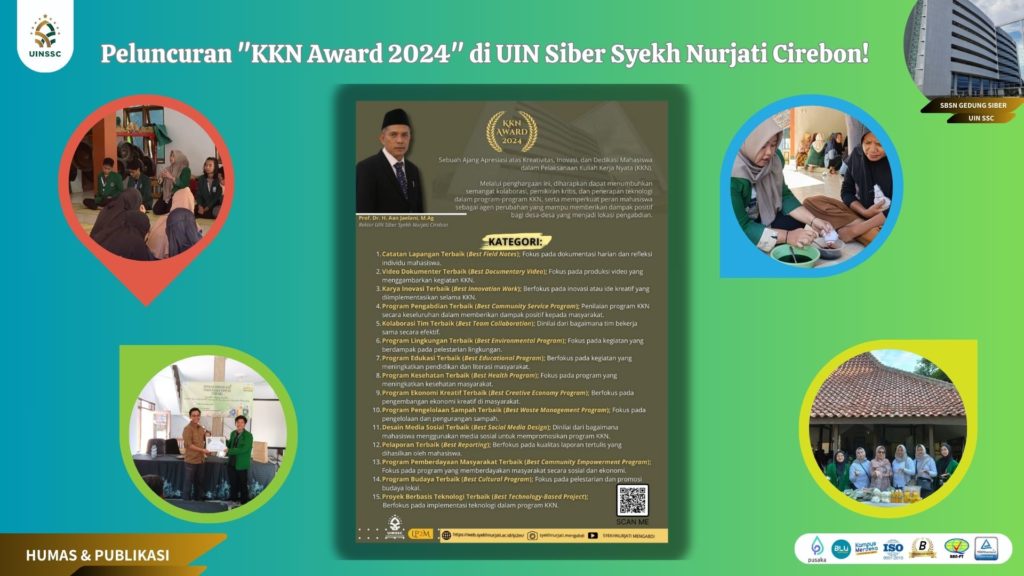 UIN Siber Cirebon – Lembaga Penelitian dan Pengabdian Kepada Masyarakat Universitas Islam Negeri Siber Syekh Nurjati Cirebon, dengan bangga mengumumkan peluncuran program terbaru, “KKN Award 2024”, sebuah ajang penghargaan bergengsi yang dirancang untuk mengapresiasi kreativitas, inovasi, dan dedikasi mahasiswa dalam pelaksanaan Kuliah Kerja Nyata (KKN). Program ini menjadi bukti nyata komitmen UIN Siber Syekh Nurjati Cirebon dalam mendorong mahasiswa untuk menjadi agen perubahan yang berdampak positif bagi masyarakat.