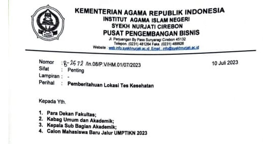 Menindaklanjuti Surat Edaran Rektor IAIN Syekh Nurati Cirebon Nomor: B- 2469/In.08/R.I/PP.00.9/06 tentang Kewajiban Pemeriksaan Kesehatan Calon Mahasiswa Baru IAIN Syekh Nurjati Cirebon Tahun 2023. Dengan ini Kami memberitahukan bahwa Lokasi Pemeriksaan Tes Kesehatan berada di Ma’had Al Jamiah Putra IAIN Syekh Nurjati Cirebon pada tanggal 11-28 Juli 2023.