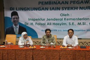 Menariknya, dalam kegiatan pembinaan pegawai, Dr. Faisal mengingatkan rektor IAIN Syekh Nurjati Cirebon, tentang implementasi nilai-nilai integritas, kode etik, dan kode perilaku pegawai ASN Kementerian Agama. Beliau juga menekankan perlunya menjaga nilai-nilai dasar Kemenag; Keimanan dan ketaqwaan kepada Tuhan YME Kementerian Agama, integritas, profesionalitas, inovasi, tanggung jawab, dan keteladanan sebagai nilai dasar yang harus dipegang teguh. Inspektur Jenderal Kementerian Agama RI berpesan kepada Prof Aan.