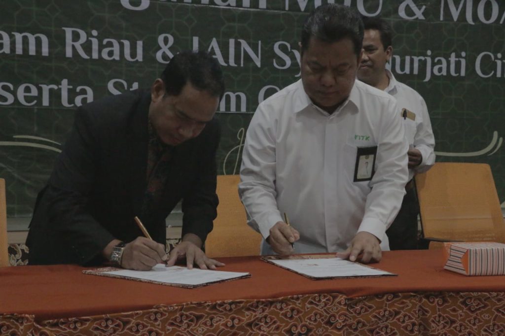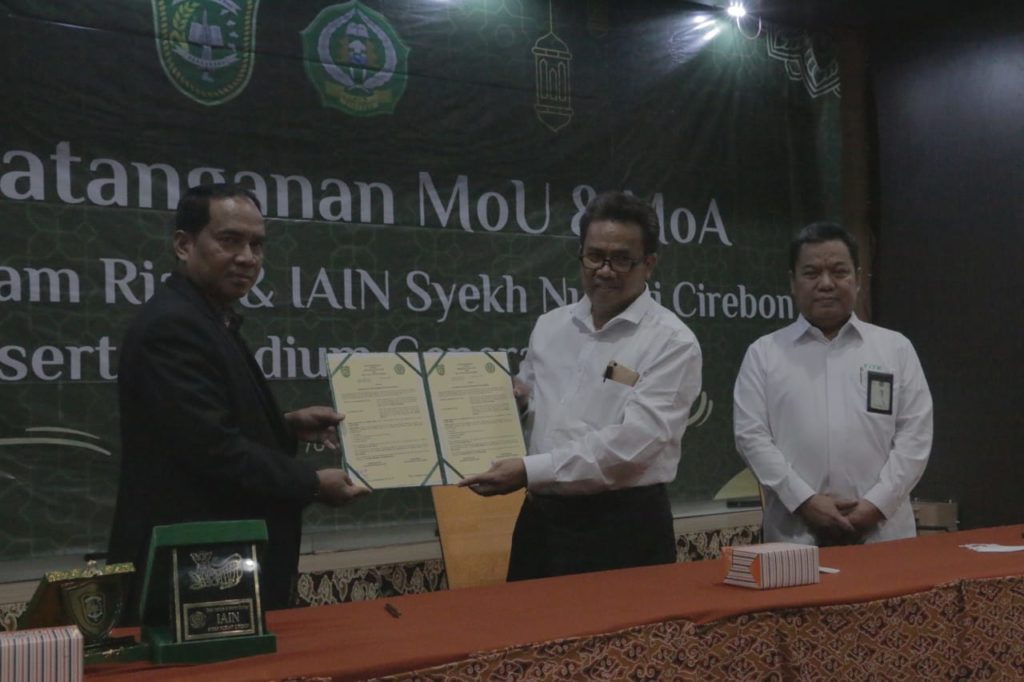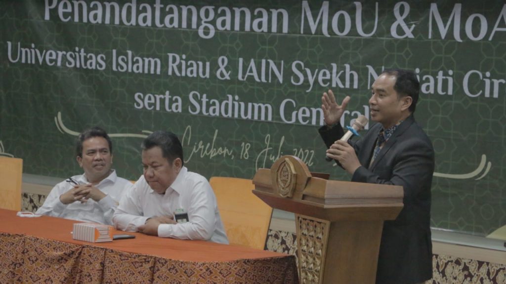 Institut Agama Islam Negeri (IAIN) Syekh Nurjati Cirebon menggelar penandatangann MoU, MoA dan Studium General dengan Universita Islam Riau (UIR) bertempat di aula gedung Fakultas Ilmu Tarbiyah dan Keguruan (FITK) IAIN Syekh Nurjati Cirebon lantai 5. Rombongan yang dipimpin oleh Dr. Zulkifli, MM. ME. Sy (Dekan Universitas Riau) diterima langsung oleh Dr. H. Ilman Nafi’a, M.Ag (Warek III) didampingi unsur pimpinan. Kegiatan diikuti sekitar 100 peserta Studium General yang terdiri dari mahasiswa. 18/07/22